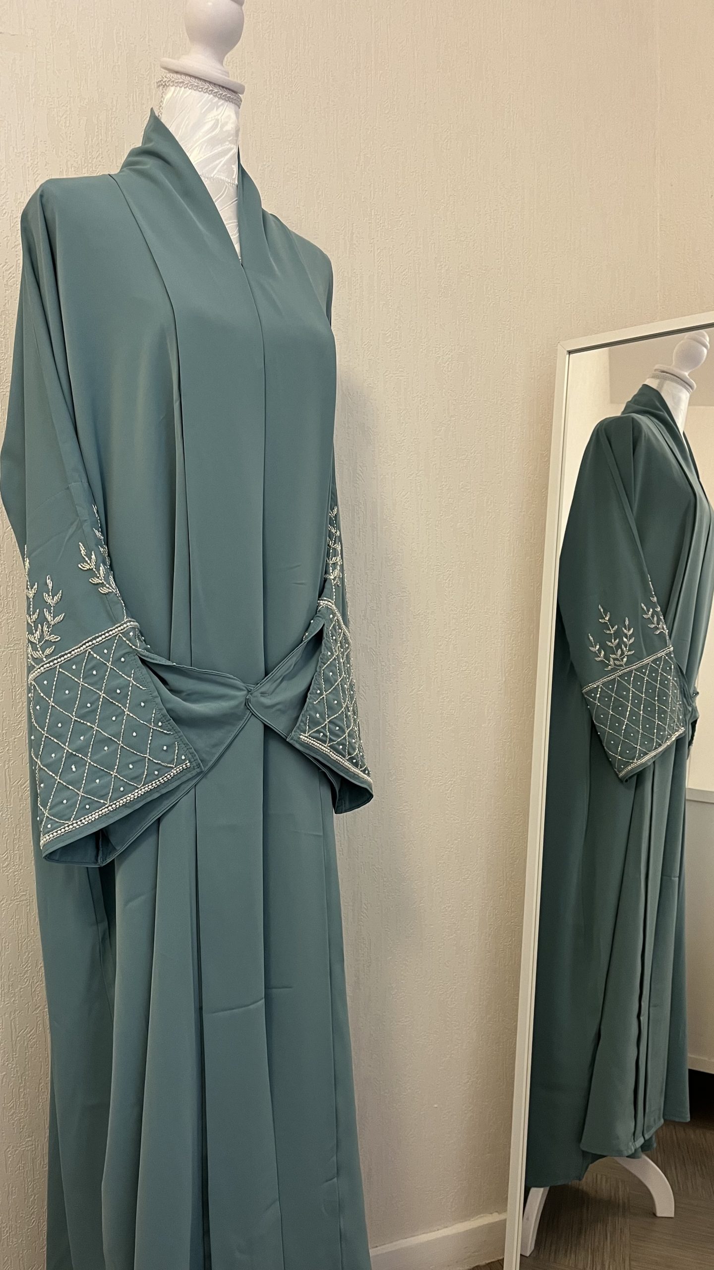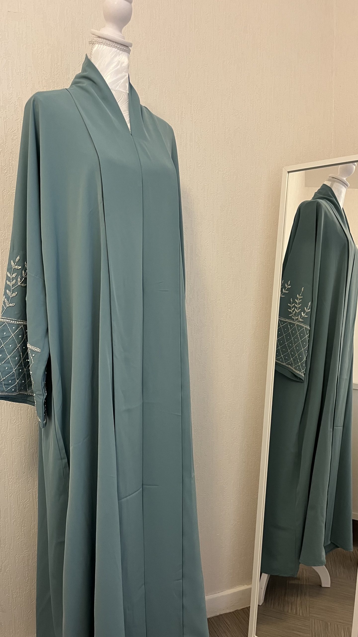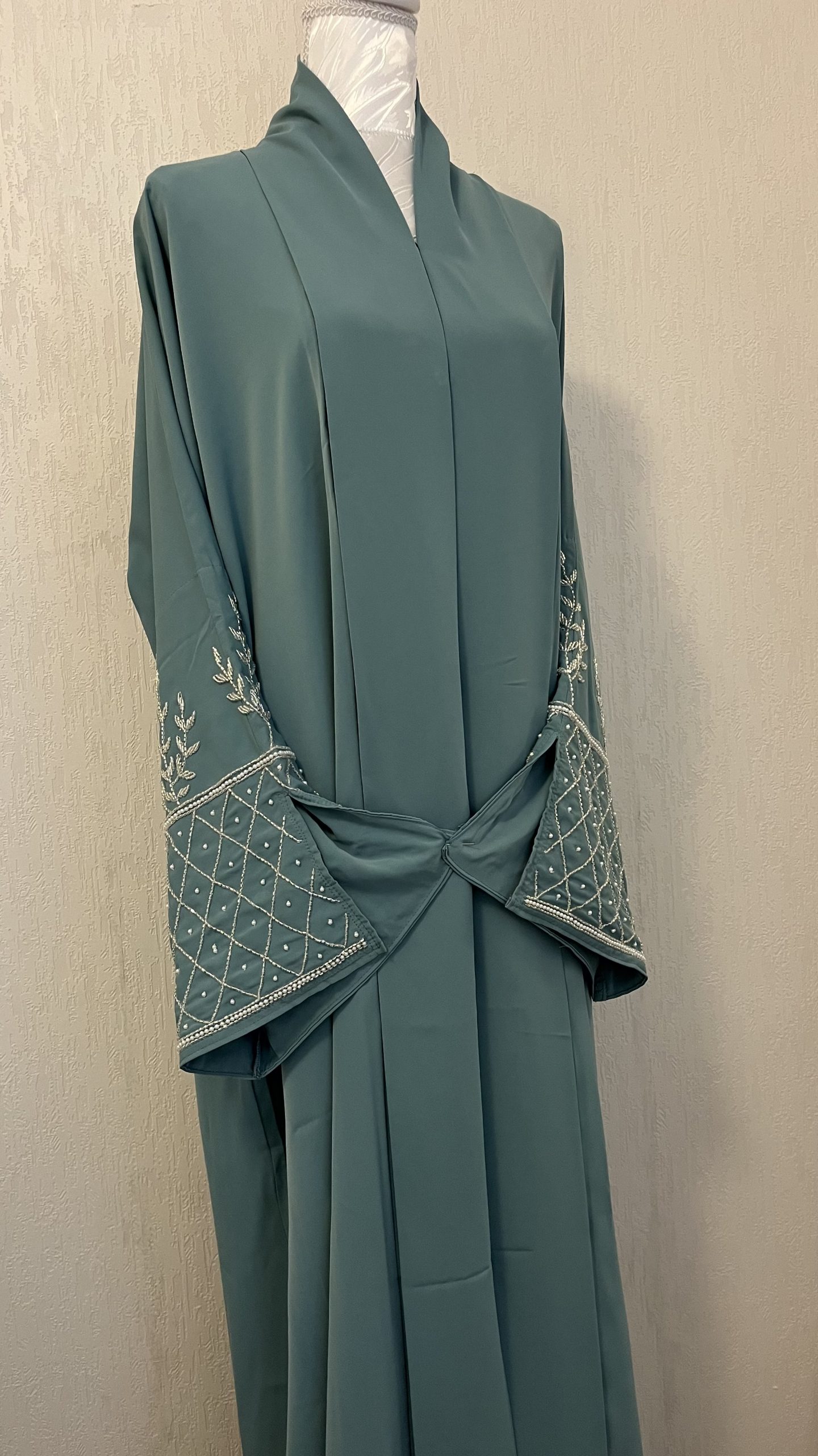 Une Abaya charmante perlée au niveau des manches, parfaite pour toutes vos occasions. Elle est conçue dans un tissu fluide directement dans nos ateliers aux Émirats Arabes Unis. Choisissez votre taille en vous référant à notre guide de taille. Le mannequin porte la taille 56. Elle est fournie avec un châle assorti et un lien de serrage.
