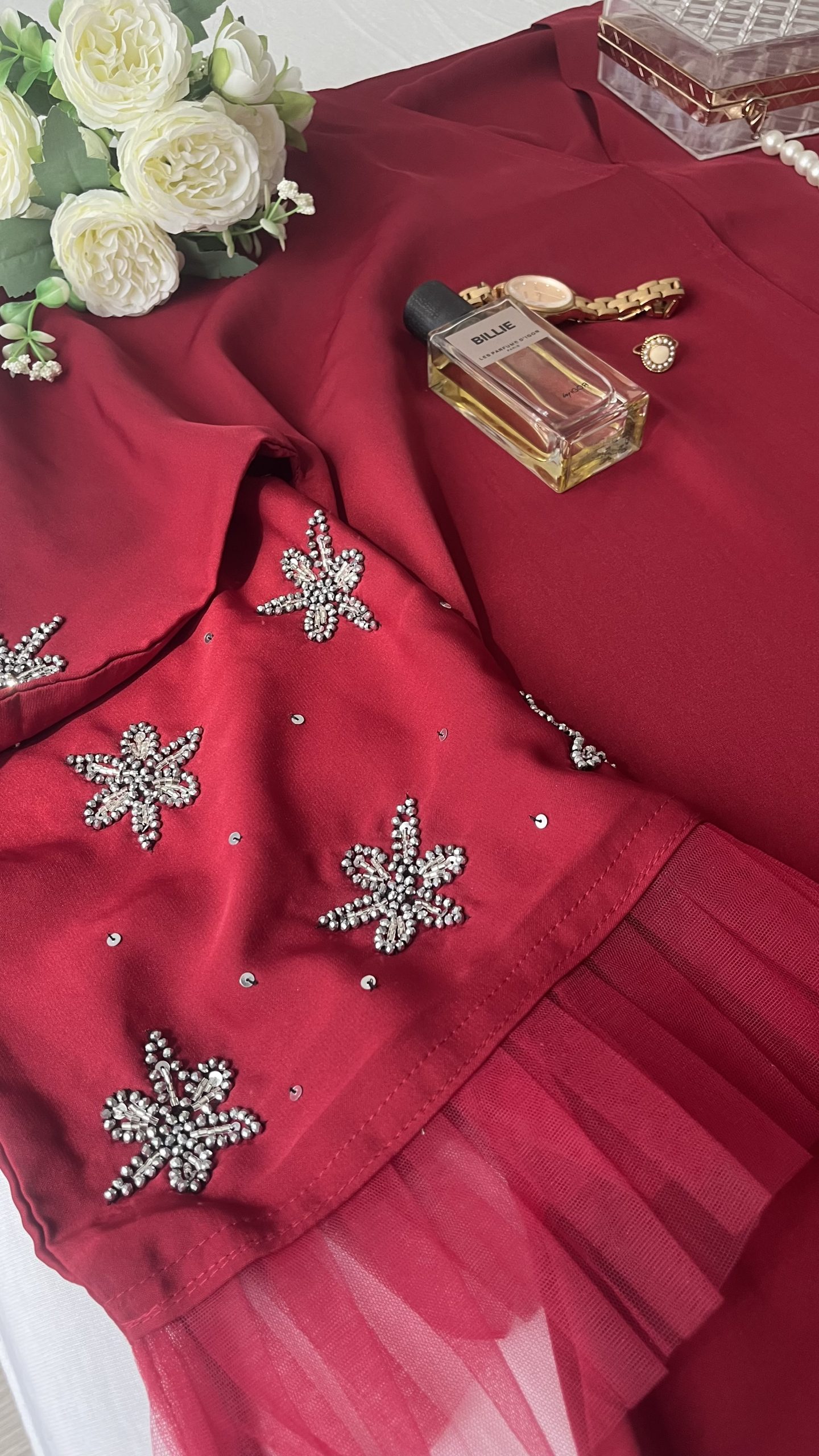 Une Abaya charmante perlée au niveau des manches, parfaite pour toutes vos occasions. Elle est conçue dans un tissu fluide directement dans nos ateliers aux Émirats Arabes Unis. Choisissez votre taille en vous référant à notre guide de tailles. Elle est fournie avec un châle assorti et un lien de serrage.